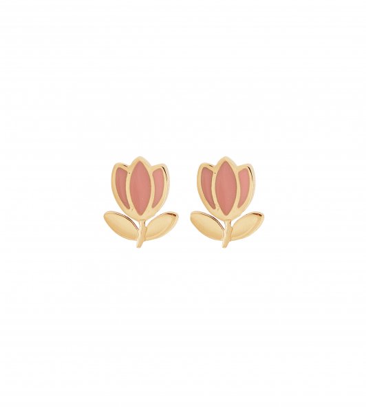 Tulip är ett fint barnsmycke med en liten emaljerad tulpan. Tulip studs har en korallfärgad tulpan i blank 14K guldplätering. Tulip är en fin present och kombineras gärna med halsband och armband till.